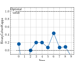 >>> from torch import rand, randint >>> # Example plotting multiple values >>> from torchmetrics.classification import BinaryCohenKappa >>> metric = BinaryCohenKappa() >>> values = [ ] >>> for _ in range(10): ... values.append(metric(rand(10), randint(2,(10,)))) >>> fig_, ax_ = metric.plot(values)