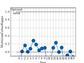 >>> from torch import randn, randint >>> # Example plotting a multiple values >>> from torchmetrics.classification import MulticlassCohenKappa >>> metric = MulticlassCohenKappa(num_classes=3) >>> values = [] >>> for _ in range(20): ... values.append(metric(randn(20,3).softmax(dim=-1), randint(3, (20,)))) >>> fig_, ax_ = metric.plot(values)