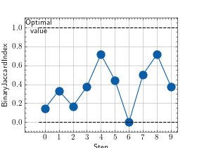 >>> # Example plotting multiple values >>> from torch import rand, randint >>> from torchmetrics.classification import BinaryJaccardIndex >>> metric = BinaryJaccardIndex() >>> values = [ ] >>> for _ in range(10): ... values.append(metric(rand(10), randint(2,(10,)))) >>> fig_, ax_ = metric.plot(values)