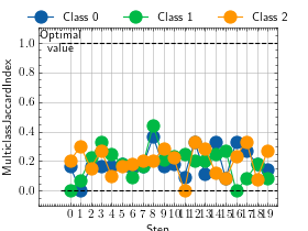 >>> # Example plotting a multiple values per class >>> from torch import randint >>> from torchmetrics.classification import MulticlassJaccardIndex >>> metric = MulticlassJaccardIndex(num_classes=3, average=None) >>> values = [] >>> for _ in range(20): ... values.append(metric(randint(3, (20,)), randint(3, (20,)))) >>> fig_, ax_ = metric.plot(values)
