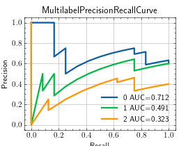 >>> from torch import rand, randint >>> from torchmetrics.classification import MultilabelPrecisionRecallCurve >>> preds = rand(20, 3) >>> target = randint(2, (20,3)) >>> metric = MultilabelPrecisionRecallCurve(num_labels=3) >>> metric.update(preds, target) >>> fig_, ax_ = metric.plot(score=True)