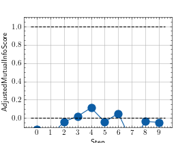 \[AMI(U,V) = \frac{MI(U,V) - E(MI(U,V))}{avg(H(U), H(V)) - E(MI(U,V))}\]Where \(U\) is a tensor of target values, \(V\) is a tensor of predictions, \(M_p(U,V)\) is the generalized mean of order \(p\) of \(U\) and \(V\), and \(MI(U,V)\) is the mutual information score between clusters \(U\) and \(V\). The metric is symmetric, therefore swapping \(U\) and \(V\) yields the same mutual information score.